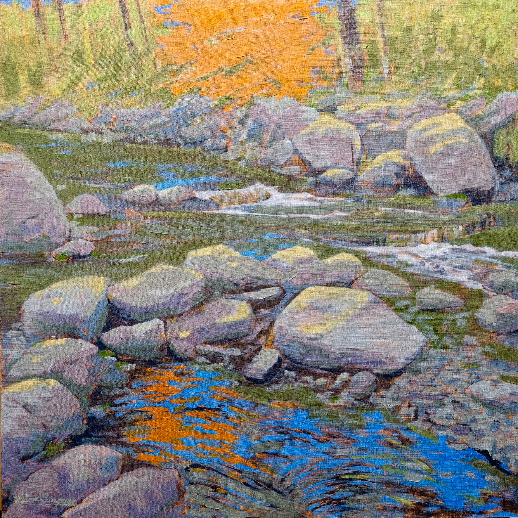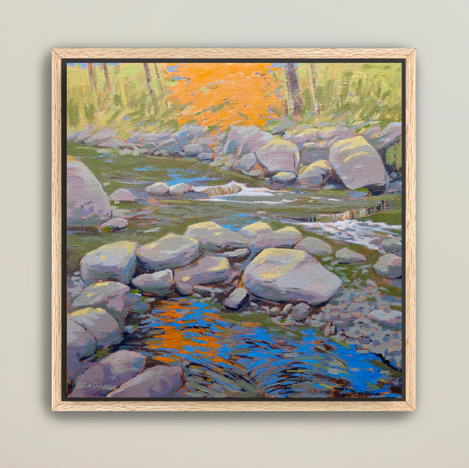 The tall oaks guarding the creek stand resolute in the late October sun, their branches adorned in fiery hues. But the air is crisp with the promise of change. So, one by one, in a graceful farewell, they succumb to the season and relinquish their copper cloaks into the cool creek waters flowing below. This creation is informed by the dynamic interplay of light and color during the season.